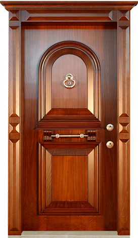 Дизайнерская входная дверь в частный дом с отделкой под дерево и решеткой №17